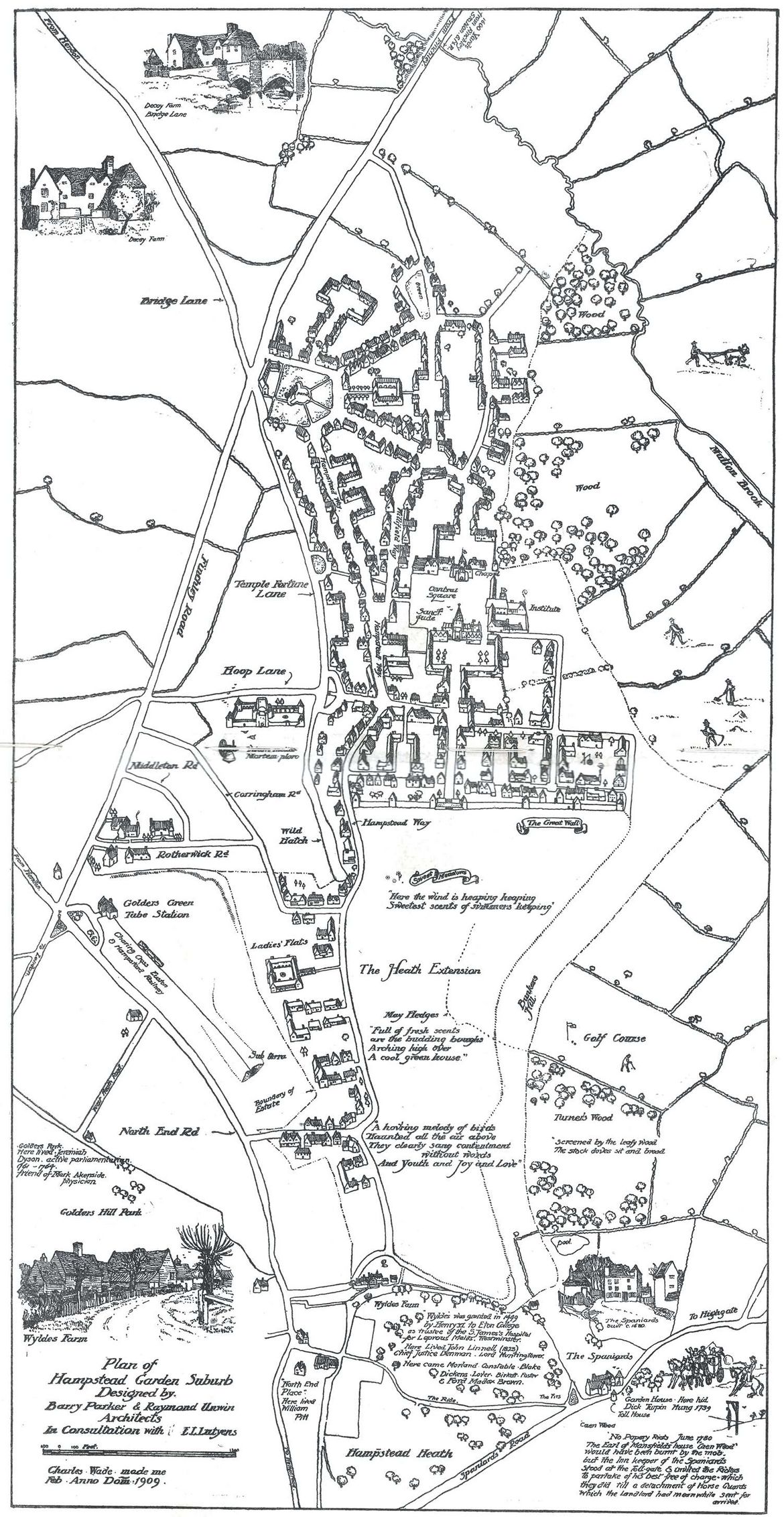 This 1909 map was drawn by Charles Paget Wade and used to illustrate Raymond Unwin's book Town Planning in Practice.